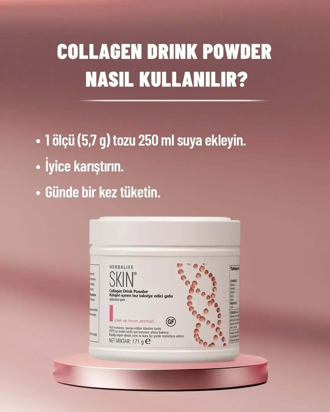 Herbalife Collagen Drink Powder, takviye edici gıda kategorisinde yer alır ve dengeli, çeşitli beslenme alışkanlıkları olan kişiler tarafından günlük rutine eklenebilir. Günün herhangi bir saatinde, kişisel kullanım alışkanlıklarına göre tüketilebilir.